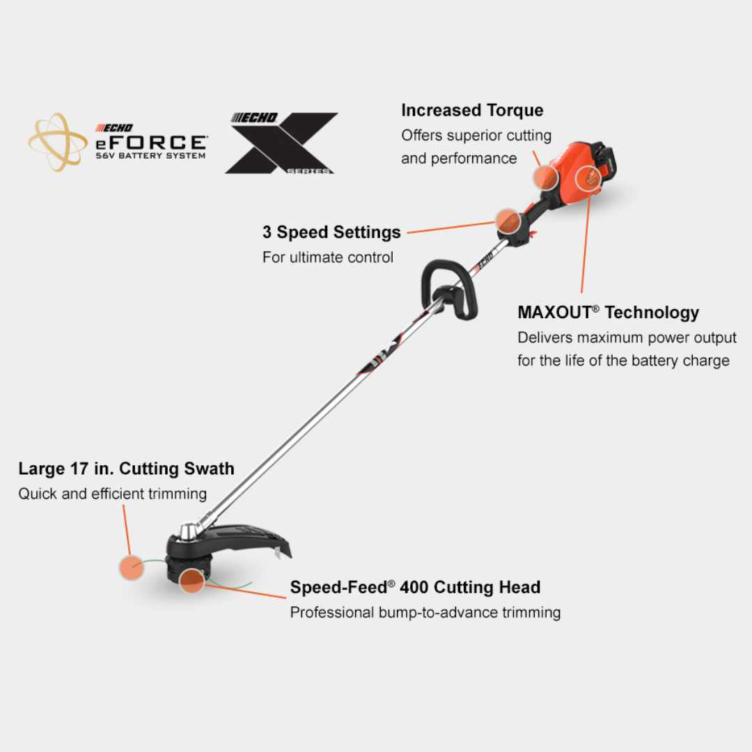 Don’t let subpar tools hold you back. Upgrade to the Echo eFORCE® 17 in. Battery Powered Straight Shaft String Trimmer and experience the future of professional lawn care. Make the smart choice for your business and the environment – invest in ECHO quality and battery-powered convenience today!
