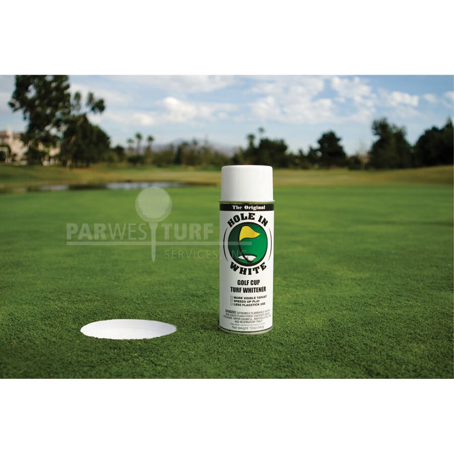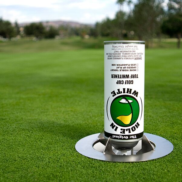 Hole in White is an innovative way to make your cups more visible to both golfers and spectators alike. The paint is easily applied, and the long-lasting application yields over 80 holes per can. This patented process requires minimal prep time, and can significantly increase play speed on your course. Simply place the can upside down into the device, and push down while you twist the can to paint the edge of the cup. You can spin it a couple of times or in different directions to ensure even coverage. You can also view the video below or the instructional pamphlet for more information.